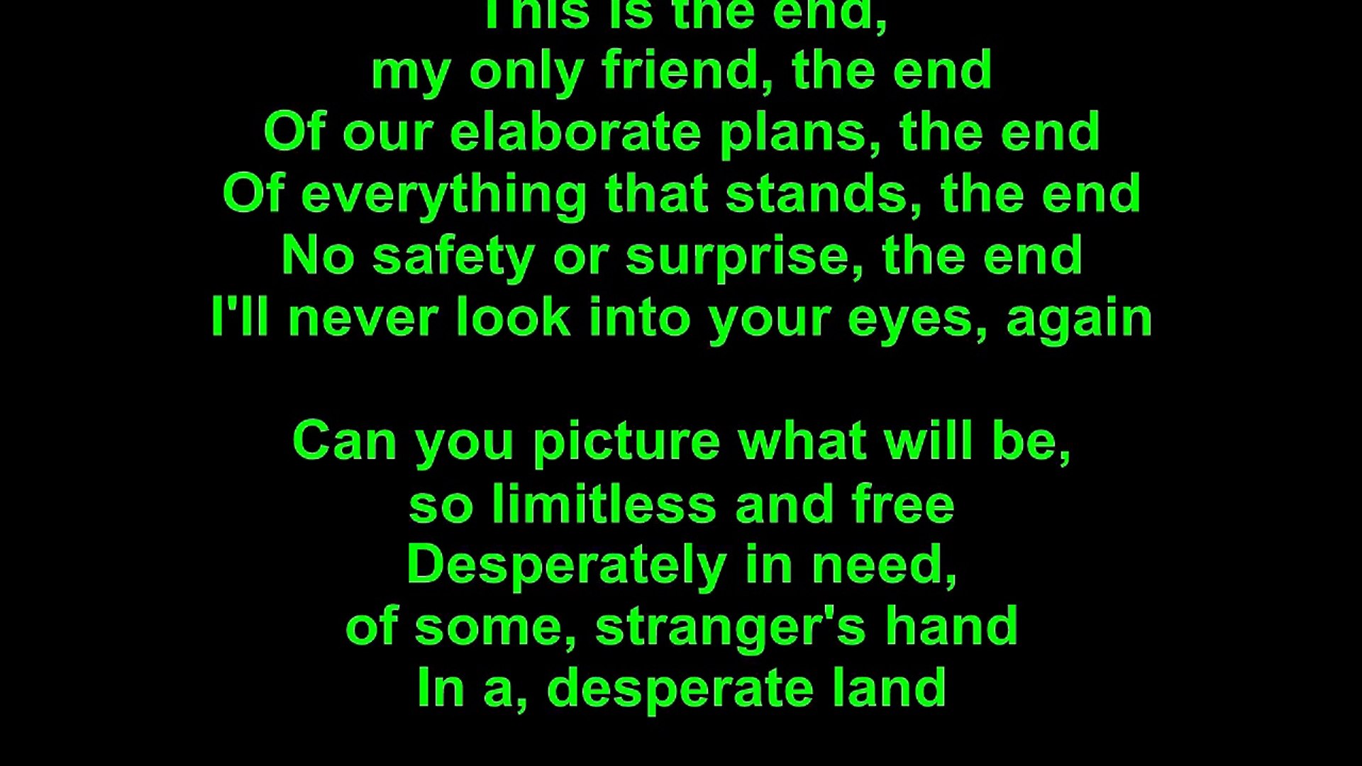 Come on baby take a chance with us Come on baby take a chance with us Come on baby take a chance with us And meet me at the back of the. This is the end This is the end of chasing dreams gone by Ever-long is this goodbye and this This is the end This is the end of our respect denied Stand with us or stand aside Bastards you. This is the end beautiful friend This is the end my only friend the end Of our elaborate plans the end Of everything that stands the end No safety or surprise the end Ill never look into your.